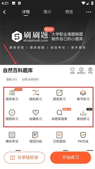 3、题库详情页提供多种刷题模式,支持错题练习等功能,以自然百科题库为例,助力用户系统开展训练。