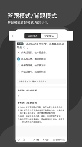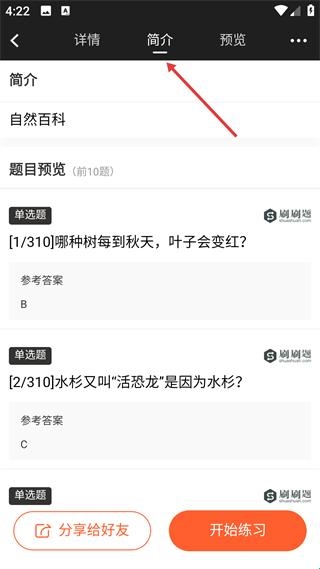 4、题库简介页展示题目预览与答案,支持分享或直接练习,帮助用户快速了解题库内容并开启学习。