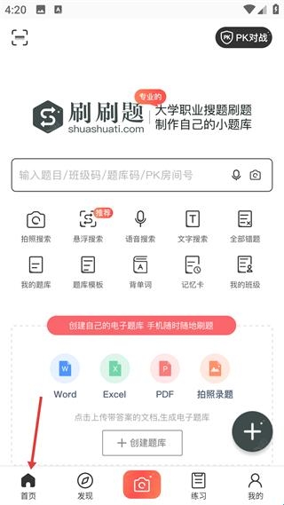 1、在本站下载好刷刷题拍照搜题并点击进入,在首页有着多种搜题方式,支持创建电子题库,可上传文档生成,还设多种学习工具,满足不同刷题需求。