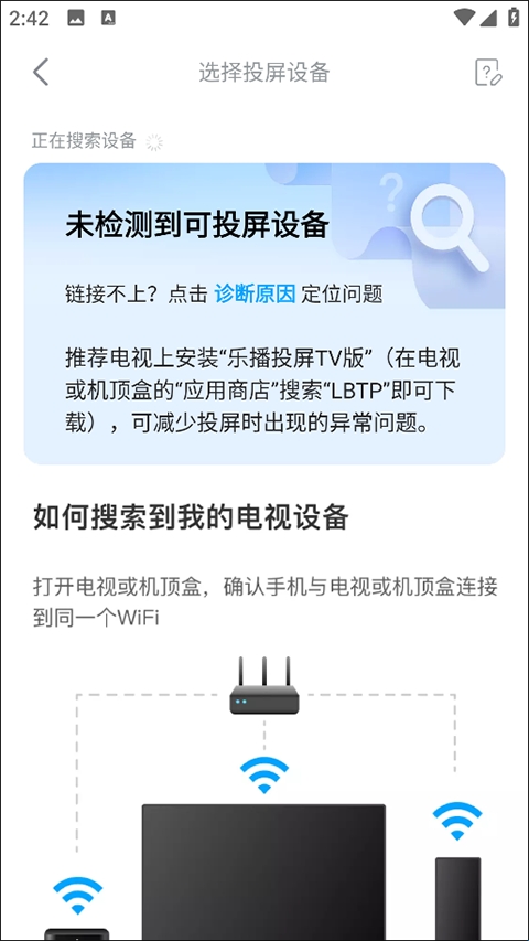 3、点击投屏按钮后,系统会自动搜索同一网络下可用的投屏设备,并将它们显示在屏幕上。这里小编没有开启投屏设备所有未找到。