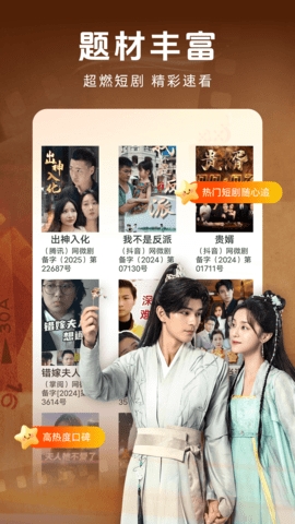 题材类型丰富:都市、古装、逆袭、甜宠等各类热门题材应有尽有。