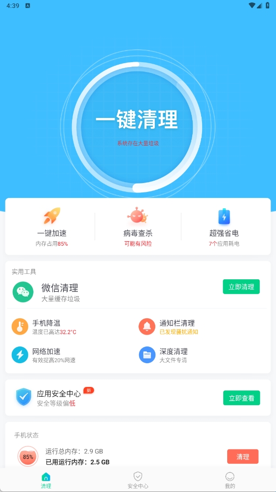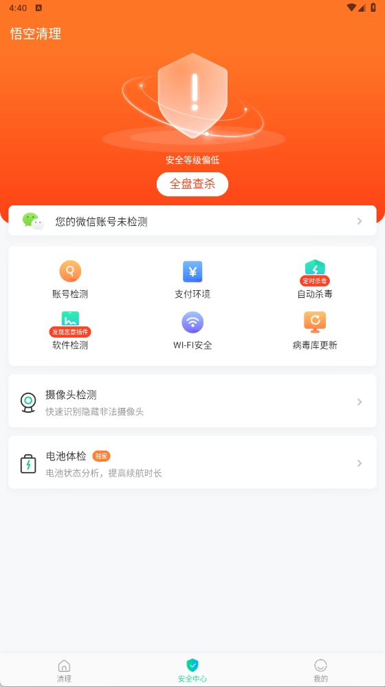 4、点击下方安全中心,可以帮助用户检查手机是否安全。