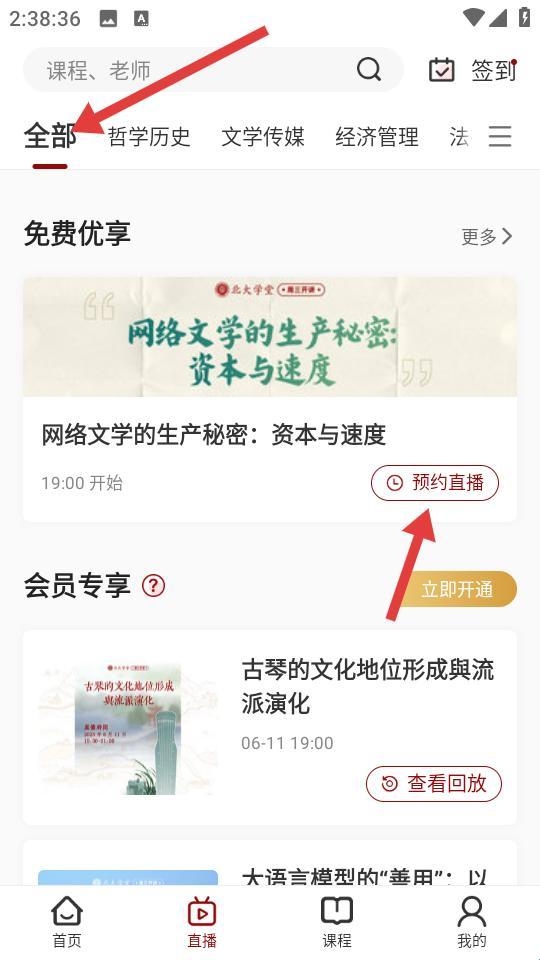 3、直播页面顶部有全部哲学历史等分类标签,呈现免费优享的网络文学课程可预约直播、会员专享内容,为用户提供实时学习与互动机会。