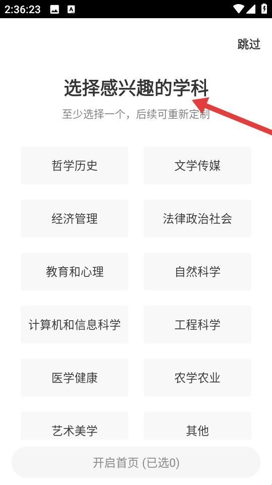 2、在初始环节引导中选择感兴趣的学科,列出哲学历史文学传媒等类别,要求至少选一个,借定制化匹配优质内容,提升学习体验。