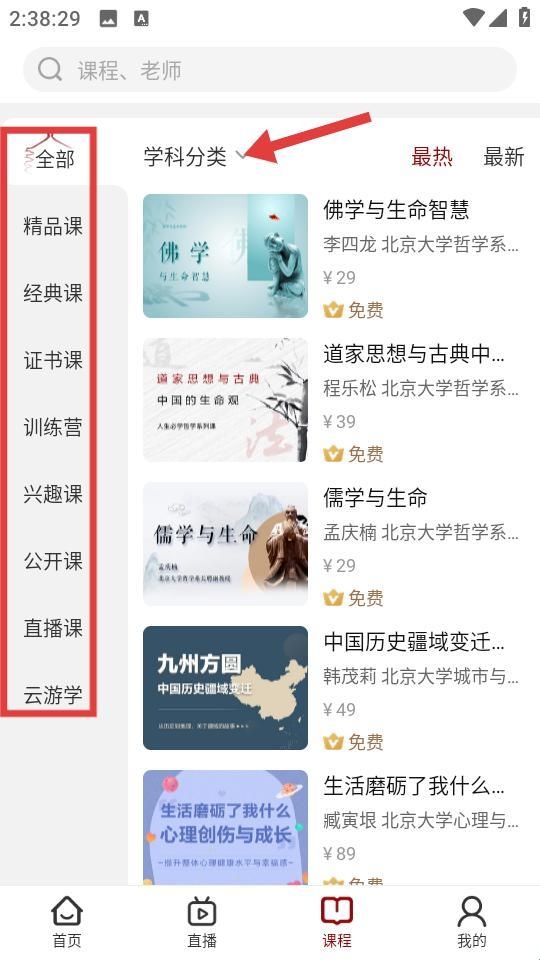 4、课程页面左侧设有全部精品课经典课等分类,上方有学科分类筛选区,右侧陈列佛学与生命智慧等多样课程,覆盖不同知识主题。