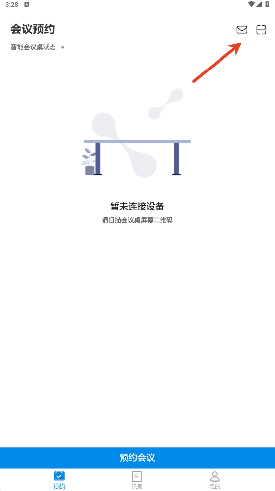 1、在本站下载好并打开登录智能会议桌,进入预约页面,用户可在该页面查看智能会议桌使用状态,点击右上角或预约会议可扫码连接设备。
