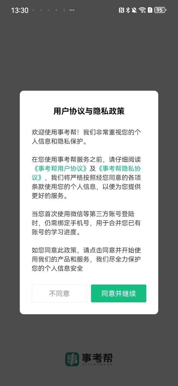 1、在本站下载好四川事考帮后并点击启动,以阅读用户协议与隐私政策后确认同意并继续为前提。