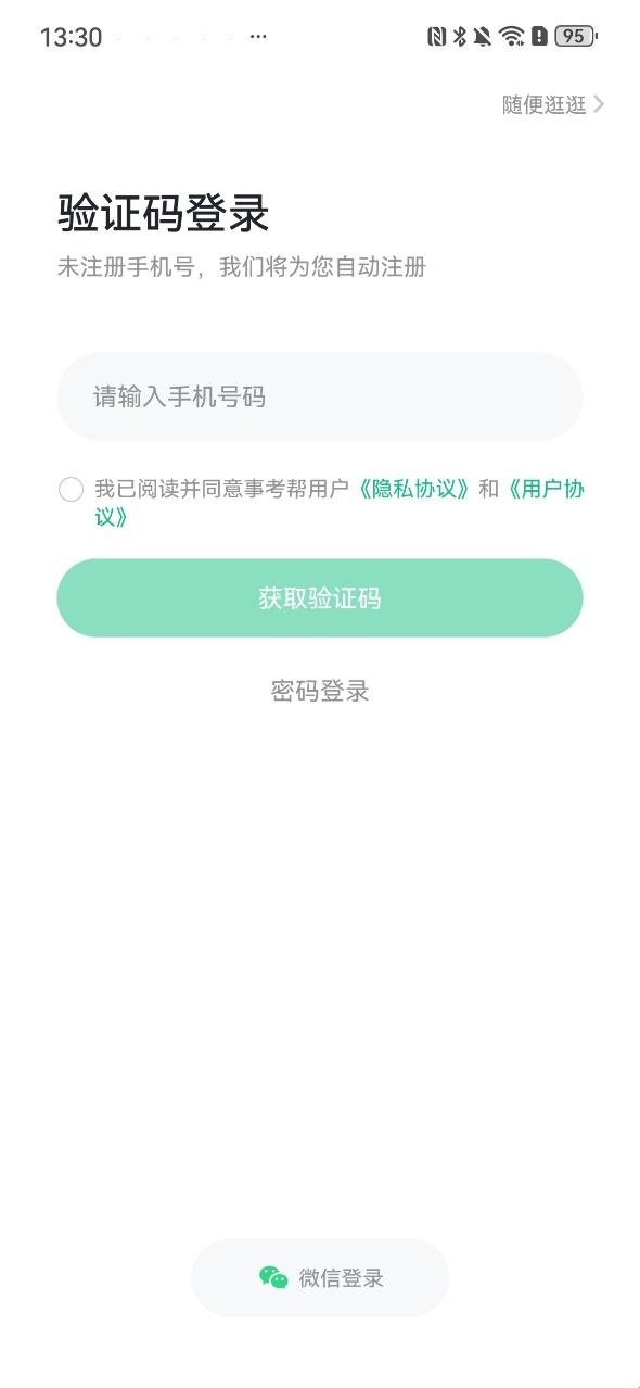 2、登录页面上,以输入手机号并勾选协议为操作,再点击获取验证码按钮。