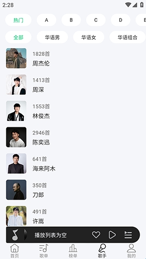 4、点击歌手板块,这里可以快速筛选歌手歌曲。