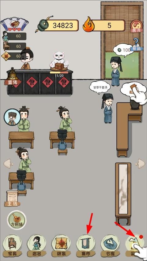 1、在本站下载好中药馆物语后,并点击进入游戏,在游戏内玩家首先需要去集市购买药材,也可通过采药获得药材。