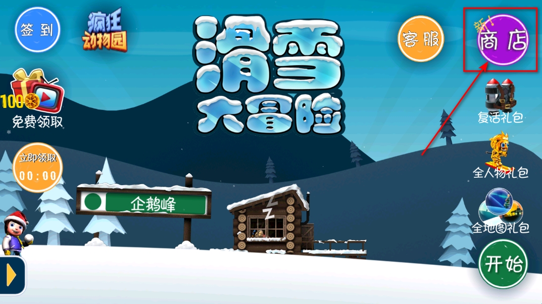 1、第一步玩家需要下载并安装好滑雪,进入游戏,点击商店按钮。
