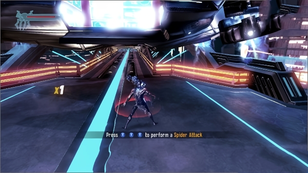 5、这里要控制未来的蜘蛛侠,没听错的话应该是2099年,这里是攻击训练,根据按键提示干掉敌人就可以了。先按XXX快速连击,然后按YY用腿攻击,接着按住Y把敌人挑空,控制XXX攻击敌人,最后按B抓住敌人后按XX解决掉。