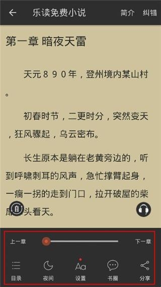 3、点击屏幕即可呼出菜单,可以在目录跳到自己想看的章节,夜间模式以及一键听书;
