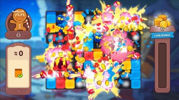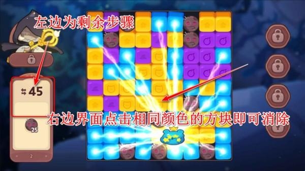 1、姜饼人女巫城堡的玩法和一般的消除手游类似,消除闯关的关卡中左边为剩余步骤,右边界面点击相同颜色的方块即可消除,成功达到关卡要求即可通关。