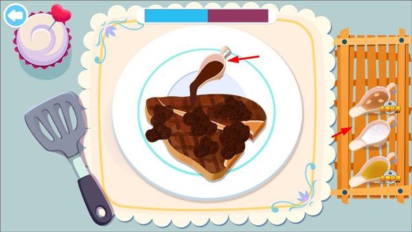 6、牛排煎好之后放入餐盘中,点击选择右侧的酱汁,为牛排增加风味;