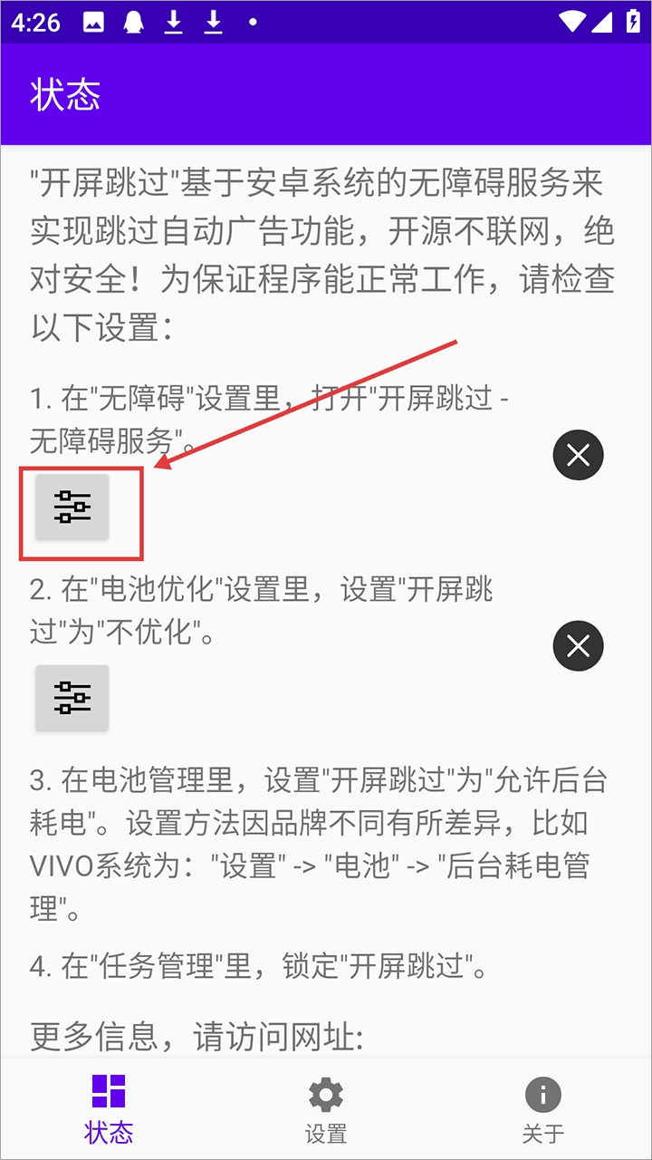 只需轻触图标,系统将自动引导至手机设置界面,快速找到开屏跳过并赋予必要权限,让您的使用体验更加流畅无阻。