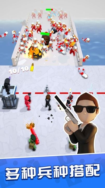 玩家可以尝试进程攻击与远程攻击的搭配、单体攻击与群体攻击的搭配,还有喷火器、电流枪等特色兵种,让玩家体验到不同兵种射击的快感。