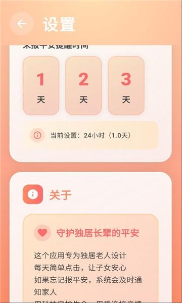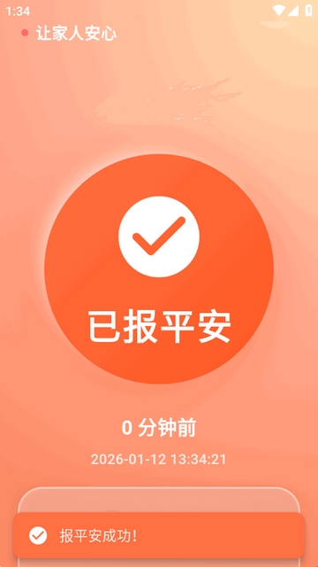 还活着:以报平安为目的的手机软件。软件采用了极简的大字体模式,页面的色彩也比较鲜艳,功能上也很简洁,操作很简单,用户使用这款APP可以点击页面上的“报平安”,让关爱的家人可以安心,整个过程只记录安全状态,不会涉及用户的隐私。