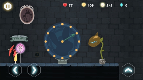 2、城堡内第一个解谜点:兔耳时钟,在场景中找到时针零件组合到兔耳时钟上,注意周围的提示,调整正确的时间,食人花即会张开嘴吐出宝珠,直至前方的台阶降下,这个解谜点就能顺利通过了。继续前行,通过前方的摆斧,我们来到城堡内的第二个解谜点。这里需要我们按一定顺序点亮石柱平台上的图案,4个图案随便按,全部按亮为止,过程中记下每个图案的点亮顺序就可以了,平台降落后通过。