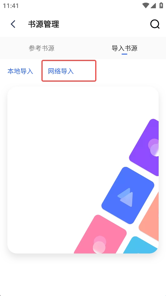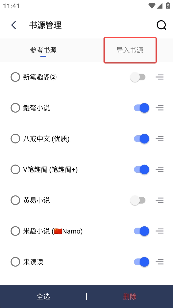 3、进入书源管理页面点击【导入书源】。