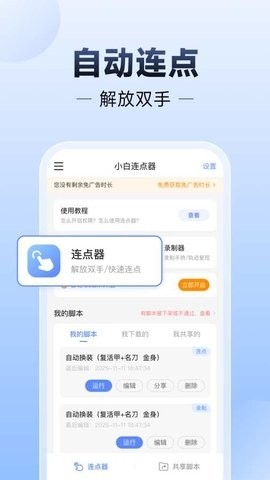 小白连点器是一款简单小巧的屏幕自动点击软件。用户可以使用这款软件进行提前录制动作,系统会自动进行一些重复的点击任务,点击的方位、时间和次数等都可以根据需要去设置,每天签到、每日打卡、抢车票、抢红包等,可以满足各种场景的点击需求。