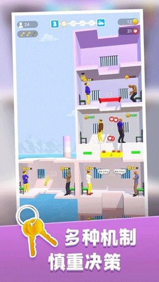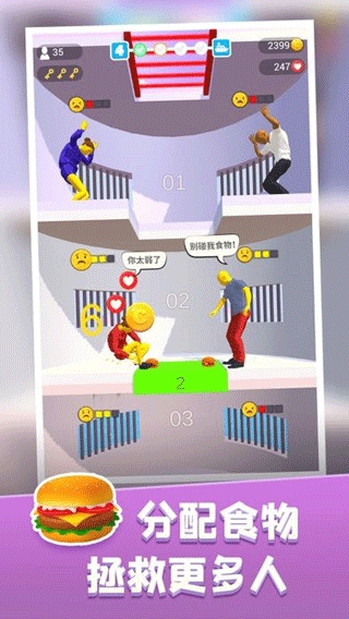 2、按住屏幕可以控制黄色的移动平台下降,长按可以加速下降,释放平台就会停住,每个平台都住着一些犯人等待投食,红色表示极度需要,黄色表示一般需要,绿色表示不需要,需要将有限的食物和资源分配给最需要的人,让其得以生存下来。