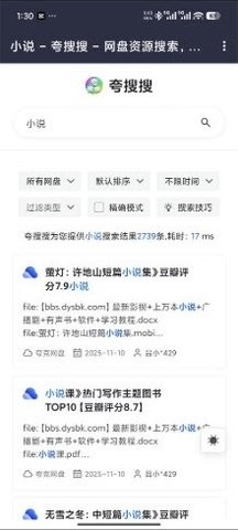 夸搜搜是一款界面简约、免费好用的互联网资源搜索应用。软件内置多个搜索源,用户可以随意的设置切换使用,页面很纯净,没有广告弹窗也不需要付费,用户可以在这里找到需要的网络资源,小说漫画等资源都可以直接找到来源进行阅读,体验感非常的好哦。