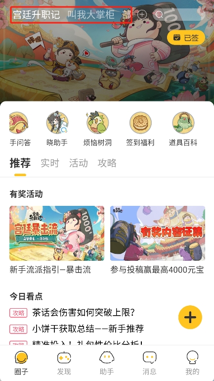 2、在首页上方选择游玩的圈子。