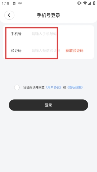 2、在手机号登录页,依次输入【手机号码】和获取的【短信验证码】。
