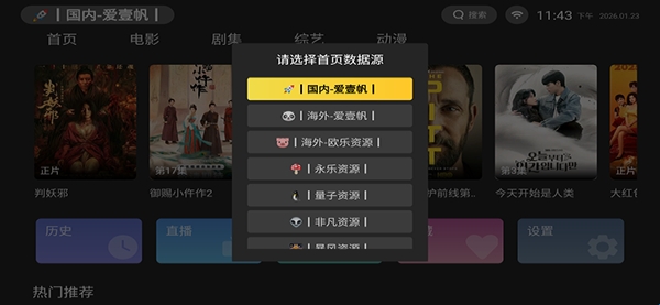 1、软件自带影视源接口,点击左上角的影视源可以切换。