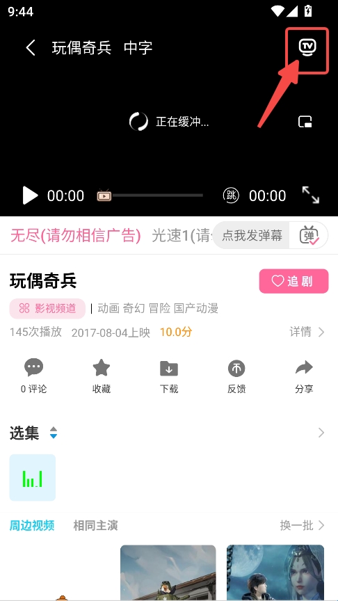 2、在播放页面点击右上角的TV按钮。