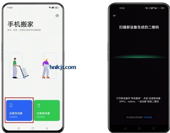 2、在旧手机上安装并打开「手机搬家」APP,选择“这是旧设备”,进入扫码界面,使用旧手机扫描新手机屏幕上的二维码。