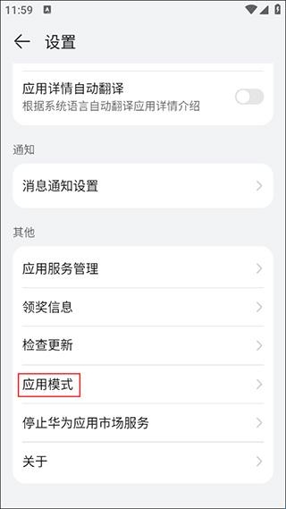 3、在设置的页面上点击“应用模式”;