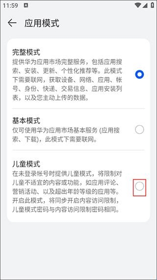4、最后在应用模式的页面上点击切换“儿童模式”即可。