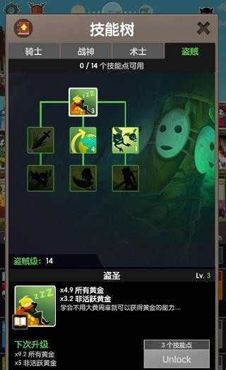4、至于盗贼加点也是我嘴热衷的加点,毕竟我懒嘛!一技能加黄金,二技能加上无声行军后妥妥的变成放置游戏;