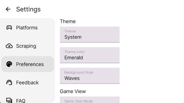 3、可进入设置页面,进行主题颜色、背景风格、游戏视图模式等个性化设置。