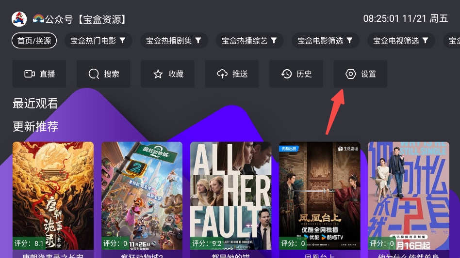1、打开app已经内置源,如果失效可以点击设置按钮。