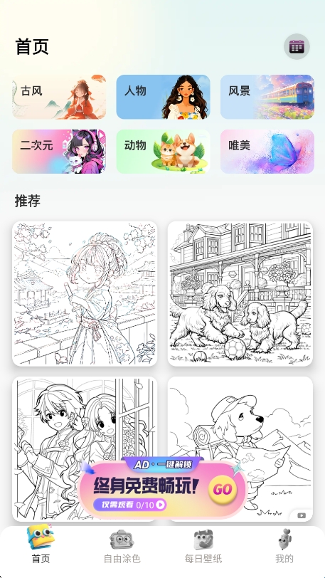 1、在本站下载安装打开,进入首页获取涂色玩法