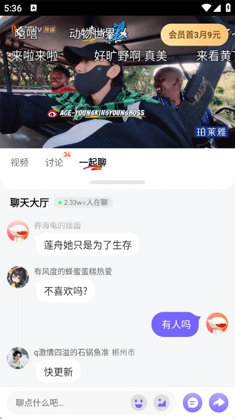 2、进入播放页后点击一起聊,和大家一起实时观看,交流影片内容;
