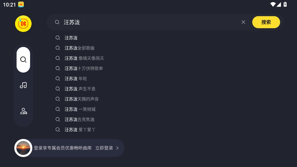 3、登录成功后,点击侧边栏的放大镜图标,就可以搜索要听的歌曲;