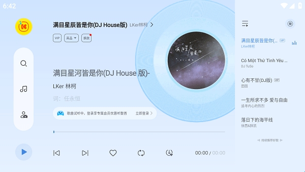 无需注册登录就能免费听海量歌曲,既节省操作时间,也能保护用户隐私;若登录账号,还可同步收藏内容和播放记录,实现多端数据连贯。