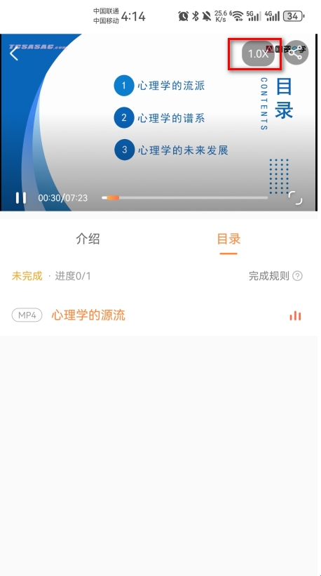 3、点击视频,右上角会显示1.0x倍速,点击1.0x。