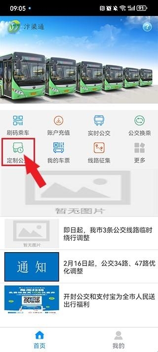 1、在软件内不仅可以查看公交信息,而且还可以进行公交的定制,用户可以在首页点击定制公交。