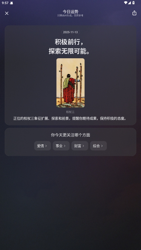 在应用中可自由洗牌和抽牌,帮助你能沉浸式探索塔罗牌的神秘,了解更多内容;