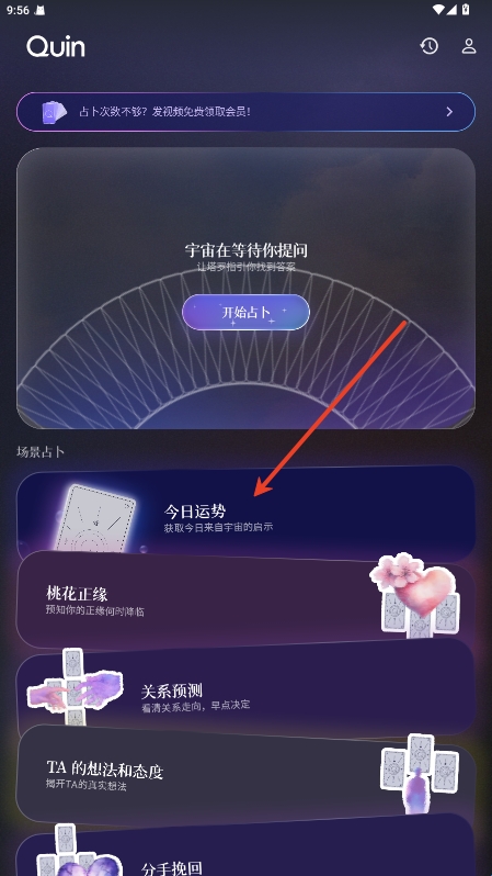 4、进入玩法介绍页面,上面提示向quin说出您的疑问,您可输入问题,之后quin会为您推荐一个牌阵,接着您需深呼吸,保持注意力集中,开始抽牌,最终将获得专业的塔罗牌解读结果;