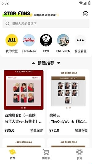 1、在软件首页提供了多个爱豆的小卡周边等商品。