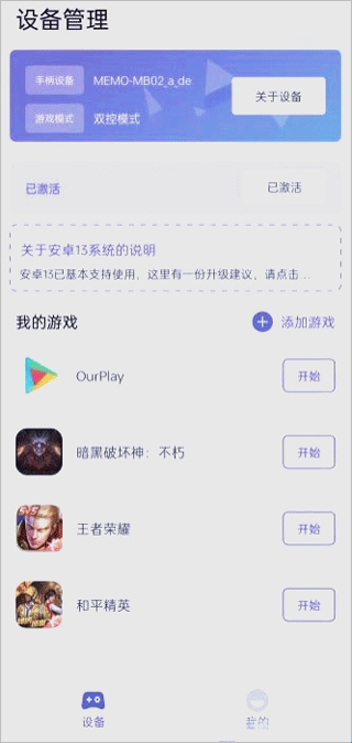 4、当设备的蓝灯持续亮起,且APP已成功识别到手柄设备,且游戏模式显示为“双控模式”时,表示设备已成功连接,完成激活后,点击“开始游戏”即可畅享游戏乐趣;