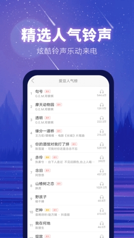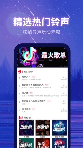1.全网热门铃声排行,听一听大家都在用的热门铃声。精彩排行每日更新,手机彩铃换不停!热门铃声排行、抖音神曲排行、搞笑彩铃排行、爱豆人气榜、飙升榜……你感兴趣的这里全都有!