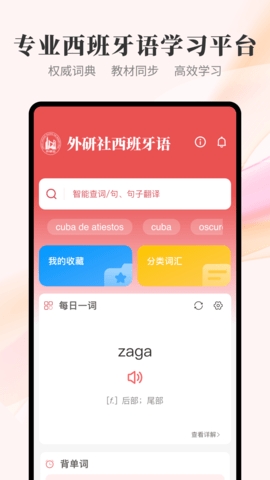 外研社西班牙语APP是一款专门用来学习西班牙语的软件,这个电子版外研社西班牙语词典由外研社官方出品,里面覆盖的学习资源十分的全面,丰富的单词词汇、例句以及语法可以随时查询和学习,能够满足众多用户的各种学习需求,让大家随时随地都可以进行学习,通过该APP还可以掌握更多精准的发音和翻译内容。