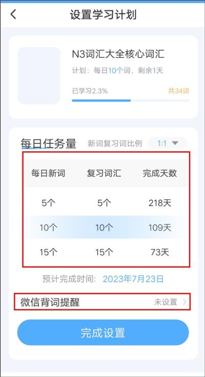 3、添加完成后,开始设置【设置学习计划】,根据自己的学习情况定制每日背诵目标。用户还可开启微信提醒防止忘记背诵打卡。